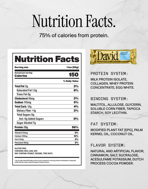 David Bar Cinnamon Roll (12pk) offers a delicious, high-protein snack crafted to fuel your active lifestyle. Infused with warm cinnamon and sweet, buttery notes, it delivers the comforting taste of a cinnamon roll while supporting muscle recovery and lasting energy. Conveniently packaged in a 12-count box, it’s perfect for on-the-go fueling, post-workout nourishment, or a satisfying anytime snack. Expertly formulated to provide quality protein without compromising flavor, this bar helps you stay on track with your fitness goals one tasty bite at a time.